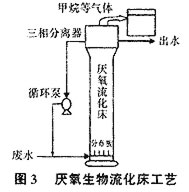 厭氧生物流化床可視為特殊的氣體進(jìn)口速度為零的三相流化床。這是因為厭氧反應(yīng)過程分為水解酸化、產(chǎn)酸和產(chǎn)甲烷3個階段,床內(nèi)雖無需通氧或空氣,但產(chǎn)甲烷菌產(chǎn)生的氣體與床內(nèi)液、固兩相混和即成三相流化狀態(tài)。厭氧生物流化床工藝如圖3所示。為維持較高的上流速度,需采用較大的回流比。厭氧生物流化床內(nèi)微生物種群的分布趨于均一化,在床中央?yún)^(qū)域生物膜的產(chǎn)酸活性和產(chǎn)甲烷活性都很高,從而使其有效負(fù)荷大大提高。